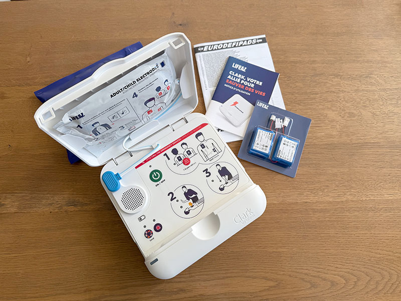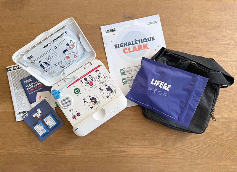 Une fois la commande passée, nous avons donc reçu, quelques semaines après, un colis avec le kit complet : défibrillateur Clark, signalétique, housse de transport,…