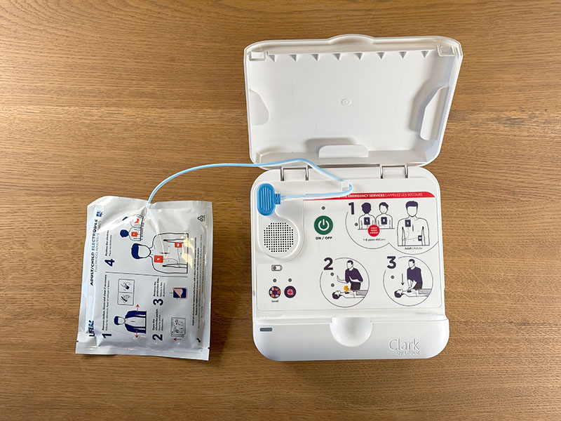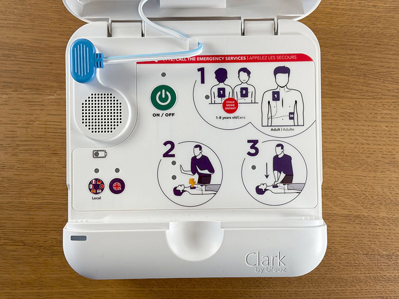 Le défibrillateur Clark qui m’a été présenté est en fait un petit objet qui fait environ 25x25cm sur 8 centimètres de haut, qui ne pèse pas lourd (environ 1,5 kg) et qui est totalement autonome au niveau électrique. Il est destiné à tout type de public, avec un guide vocal et visuel qui va assister l’utilisateur dans la pose des électrodes et sa mise en œuvre puis piloter automatiquement la suite des opérations en fonction de ce qu’il va détecter. Il peut s’installer sur des adultes et des enfants, avec une paire d’électrodes universelle.