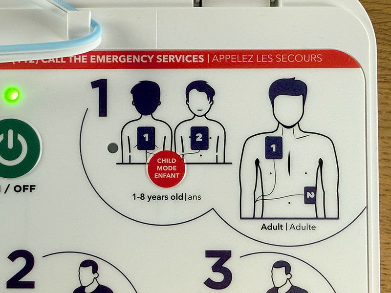 En appuyant sur le gros bouton vert « On/Off », un message vocal nous explique tout ce qu’il y a à faire : alerter les secours, dégager le torse de la victime, placer les électrodes (dans la pochette) aux emplacements 1 et 2, appuyer fermement et ensuite, laisser faire la machine.