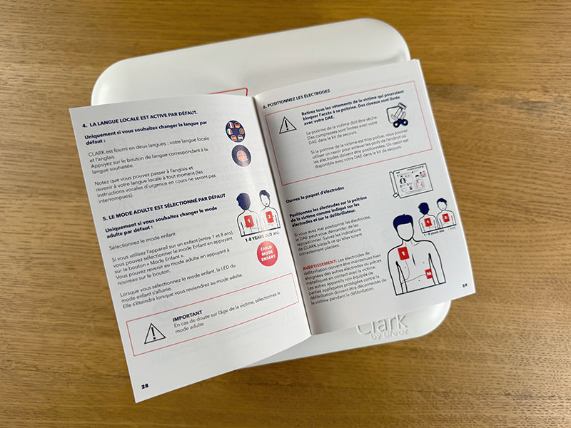 Le défibrillateur s’ouvre facilement et dévoile l’interface d’utilisation, avec tous les schémas nécessaires. Il est par défaut en français, mais peut aussi basculer dans d’autres langues.