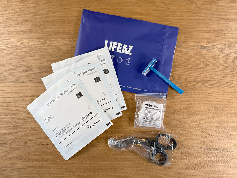 Le « kit de soins » qui est fourni contient en fait l’essentiel pour s’occuper de la victime : un ciseau pour découper les vêtements si nécessaire, un rasoir pour retirer les poils aux endroits où coller les électrodes, des gants de protection, des compresses de gaze stérile… Juste ce qu’il faut.