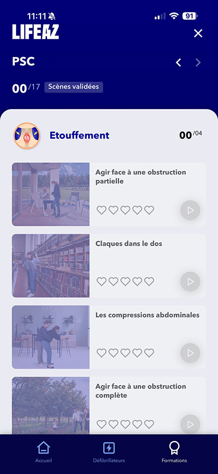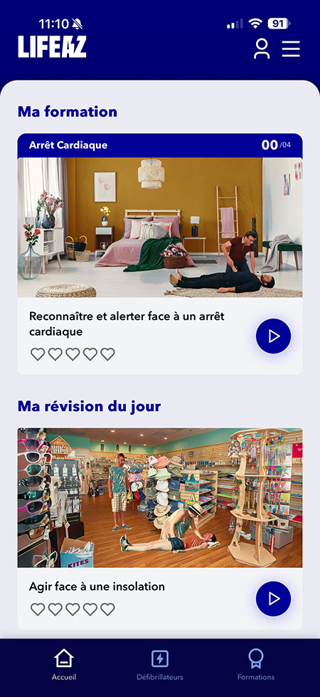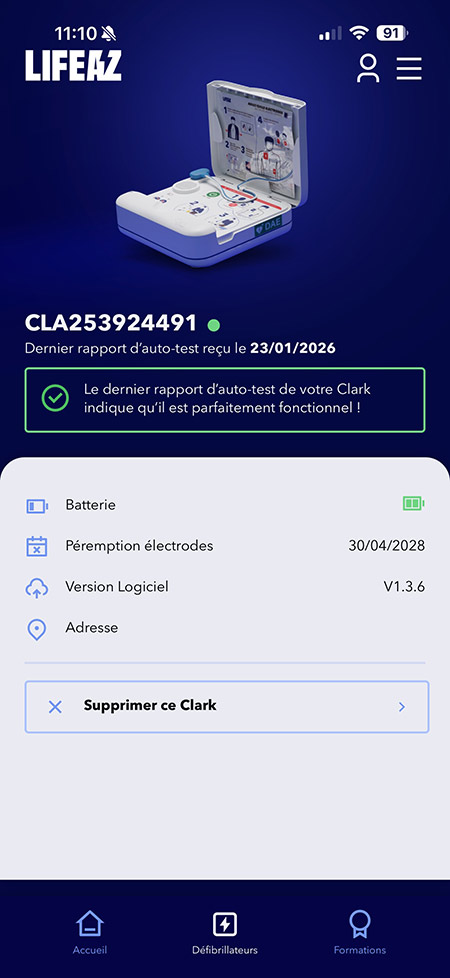 L’application permet aussi de se former aux gestes de premiers secours (pas seulement à l’utilisation du défibrillateur), permet de gérer et de monitorer l’appareil (ici, l’adresse n’est pas indiquée, car le club est fermé au public et donc le défibrillateur n’est pas accessible en permanence).