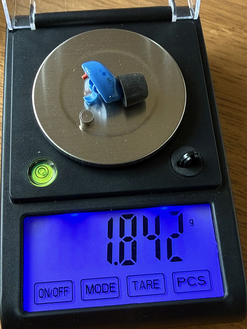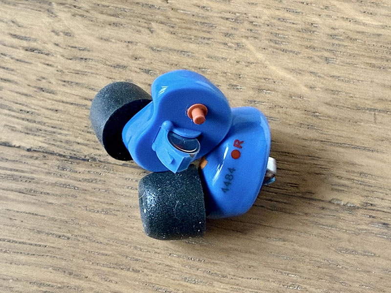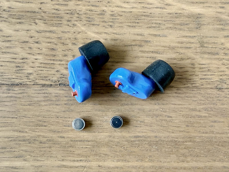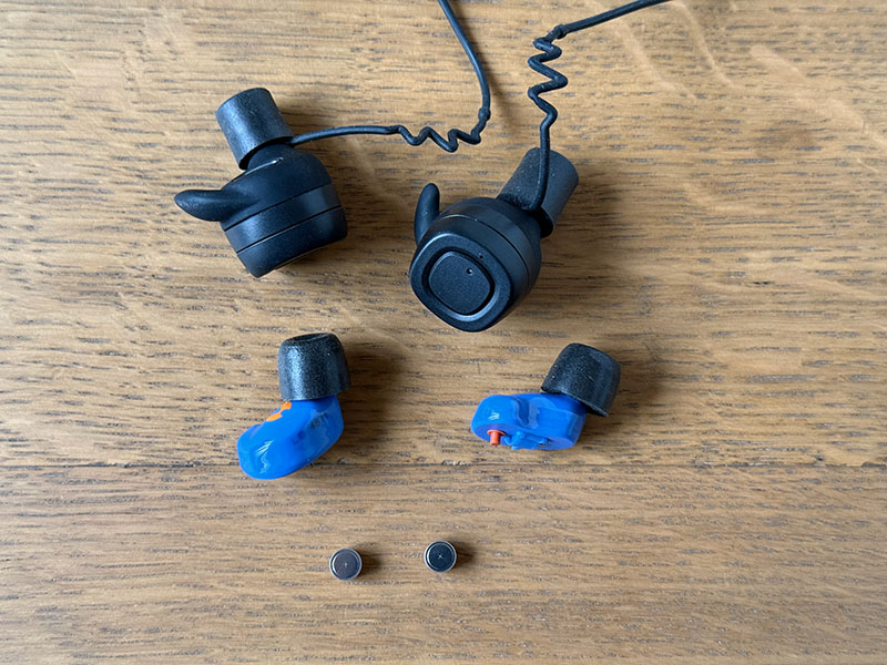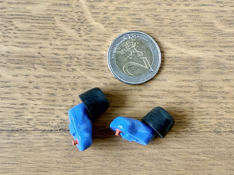 Ce sont des bouchons actifs (c’est-à-dire qu’ils permettent d’amplifier les sons extérieurs tout en coupant les détonations) de couleur bleu, tout petits et très légers : sur une balance de précision, un écouteur avec sa pile pèse 1,8 g !