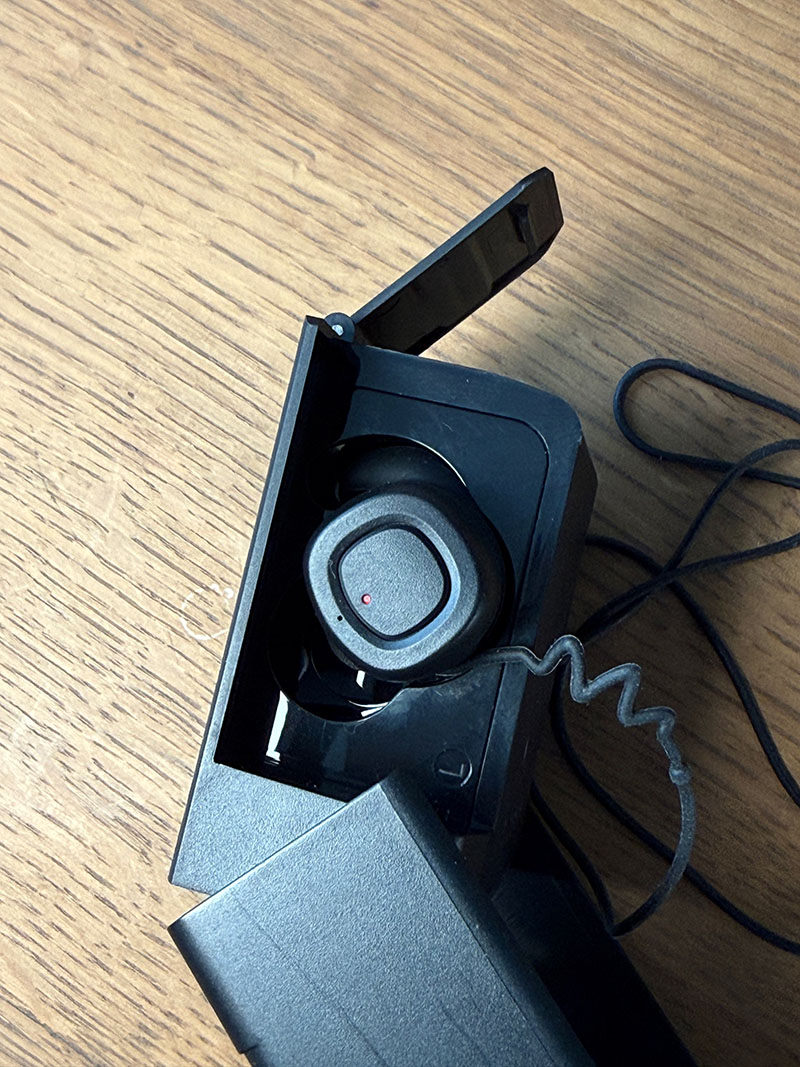 Les écouteurs sont rangés au quotidien dans un boitier noir, qui sert aussi de station de charge. En effet, les écouteurs n’ont pas de prises directes pour les recharger et c’est le boitier qui fait office d’interface, lui-même étant connectable à une prise USB-C classique.