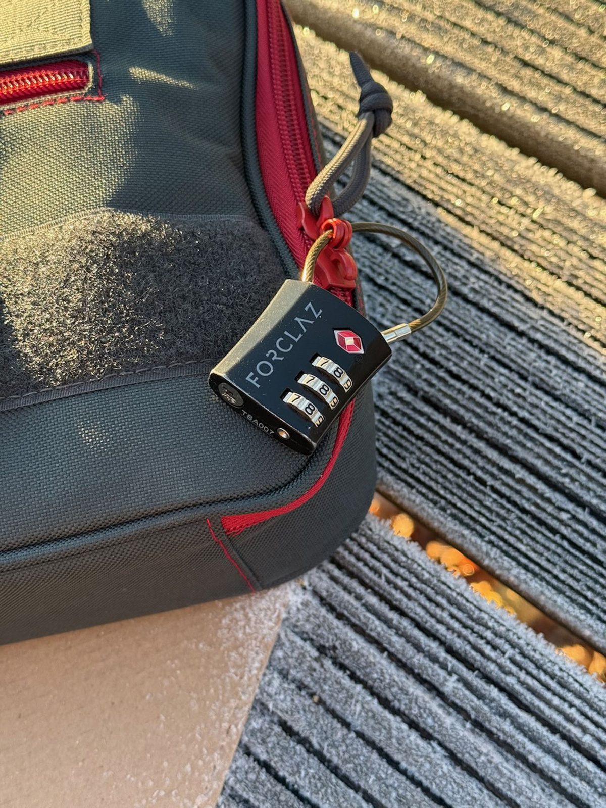 A noter que les fermetures éclairs permettant d’accéder au compartiment principal sont équipées de deux oeillets pour y mettre un verrou à câble (par exemple les Forclaz qu’on trouve chez Décathlon et qui sont très pratiques pour ça)… Cela permet de transporter l’arme dans les conditions requises par la réglementation française sans avoir à la démonter partiellement ou à l’équiper d’un verrou de pontet large et encombrant…