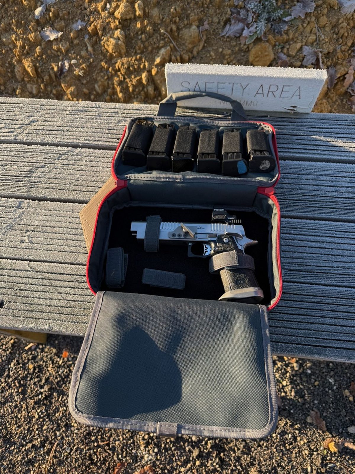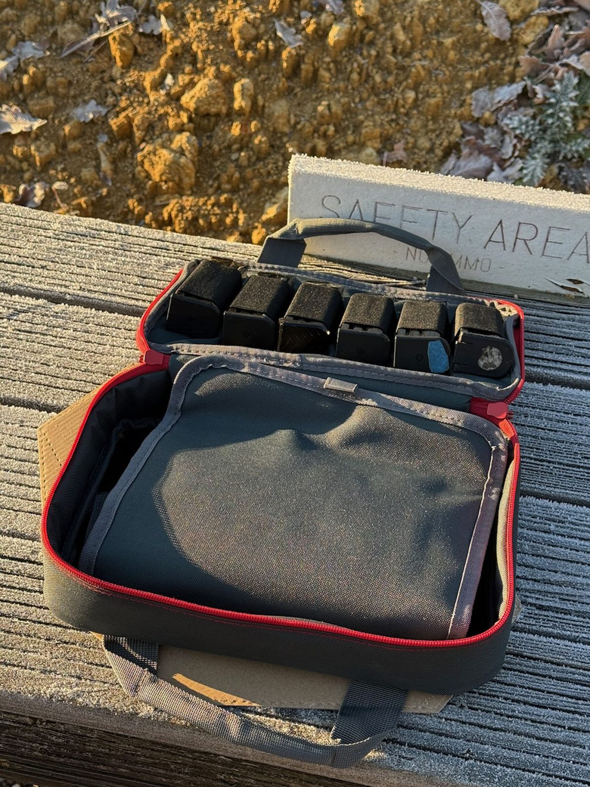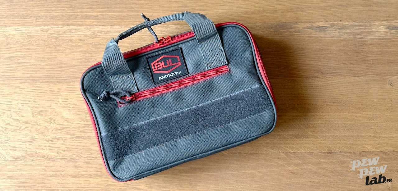 Il n’y a pas longtemps, une pochette suspendue à un présentoir chez mon armurier m’interpelle : une pochette de transport BUL Armory, d’une belle couleur grise foncée avec des rehauts de rouge au niveau des fermetures éclairs et des coutures… En plus, mes armes de poing de TSV sont des BUL, ça tomberait bien !