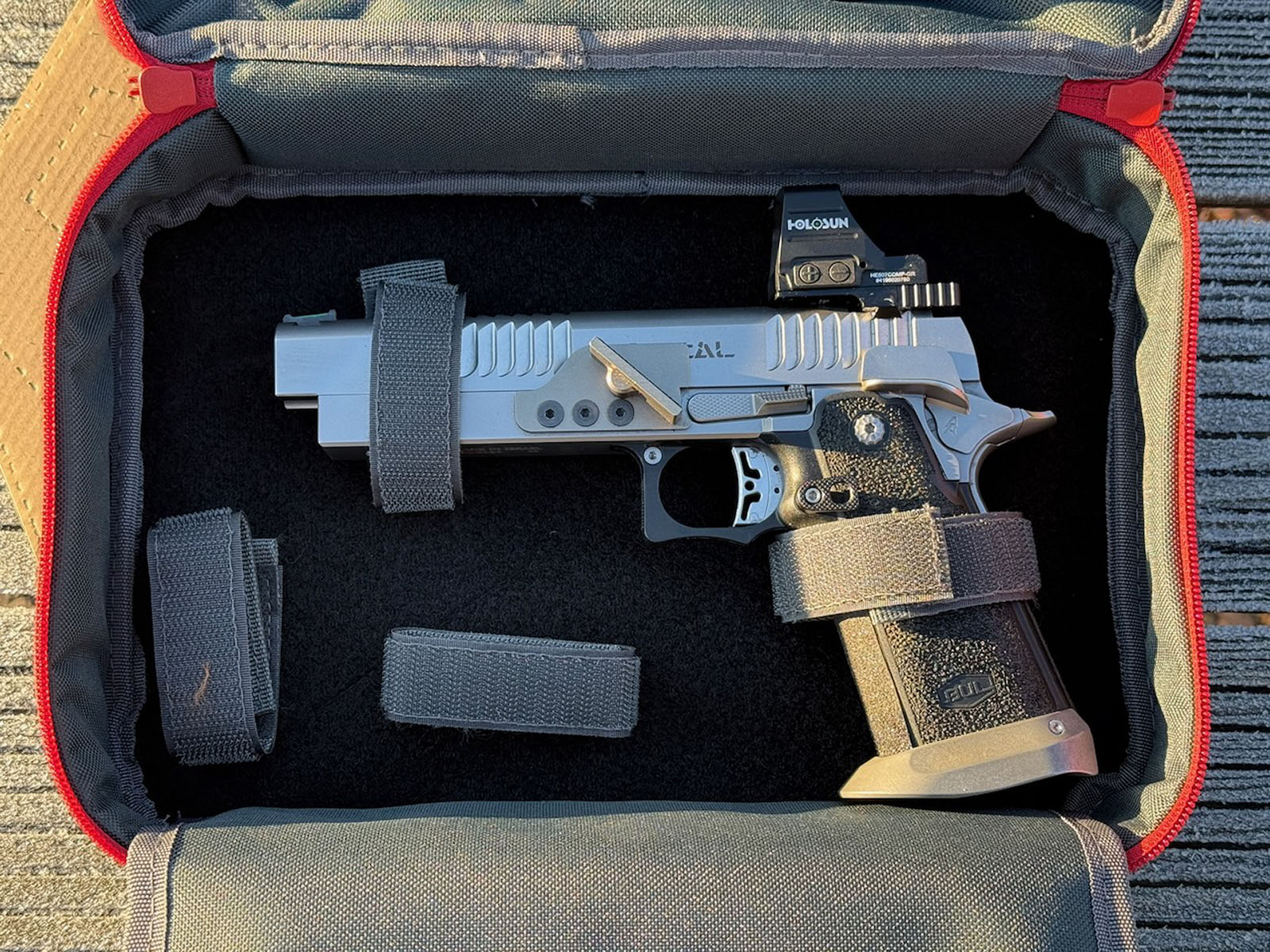 En terme de place, la pochette accueille sans problème mon Bul Radical équipé d’un canon de 5,4 pouces et son point vert Holosun. Par contre, elle est un peu juste pour en mettre deux tête bêche… Peut-être qu’avec des pistolets plus petits, on pourrait en mettre deux ?