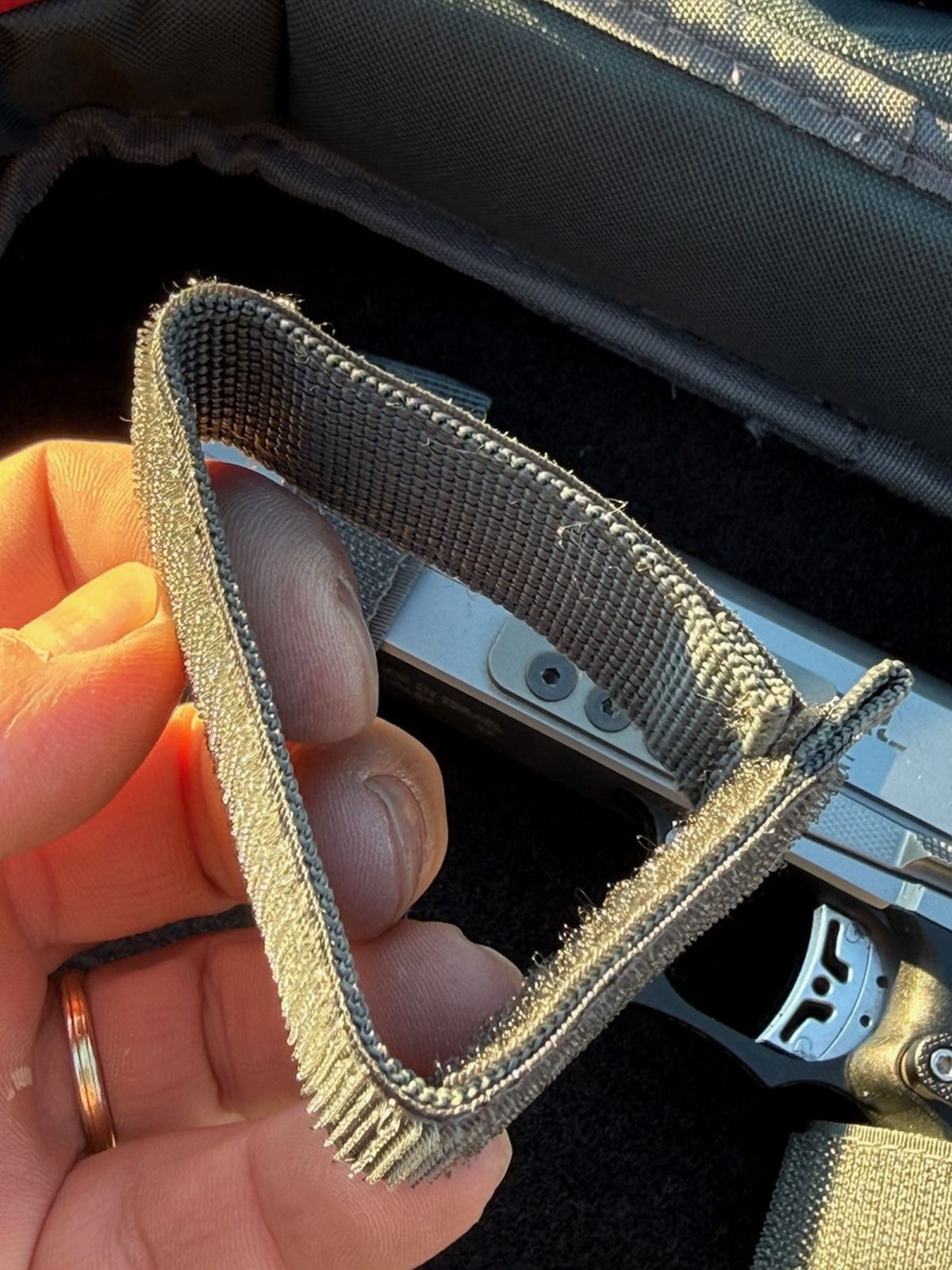 Ensuite, en soulevant le volet de protection, on découvre le fond de la pochette, constitué essentiellement d’un panneau de velcro sur toute la superficie, ce qui permet de positionner comme on veut les 4 bandes de velcro qui permettront de bien caler l’arme comme vous voulez.
